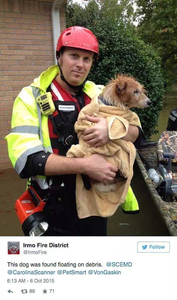 當亞歷克斯幫助一個家庭收集物品時,他在鄰居的門廊上發現了一只狗,這只狗看起來十分驚恐。亞歷克斯認為狗的主人就在附近,畢竟,誰會留下一只狗獨自被困在洪水中?
