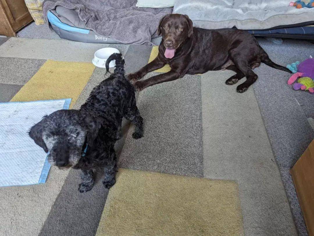 兩只狗狗約9歲大,前半生一直被用于繁殖,而且很顯然,是那種除了一窩一窩的生孩子,其他任何事都不允許做的繁殖犬...