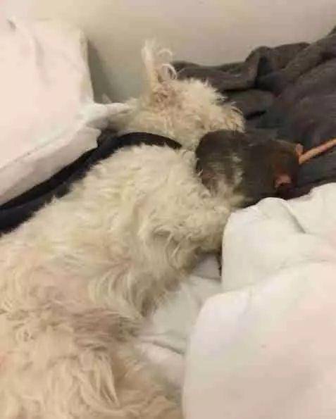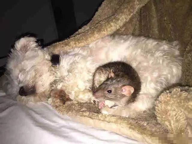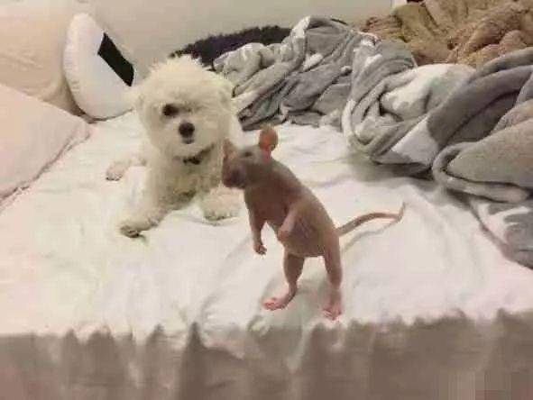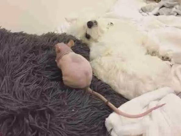 特別是那只無毛老鼠,可能因為它自己沒有毛的緣故,所以它對艾瑪的毛特別感興趣,經常幫艾瑪梳理狗毛。
