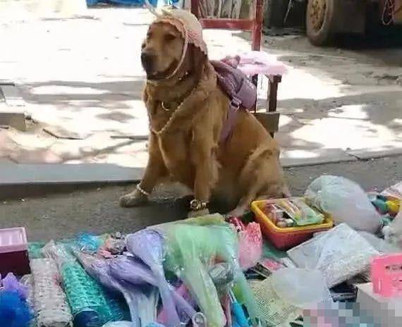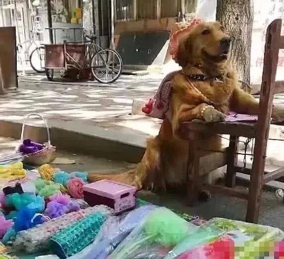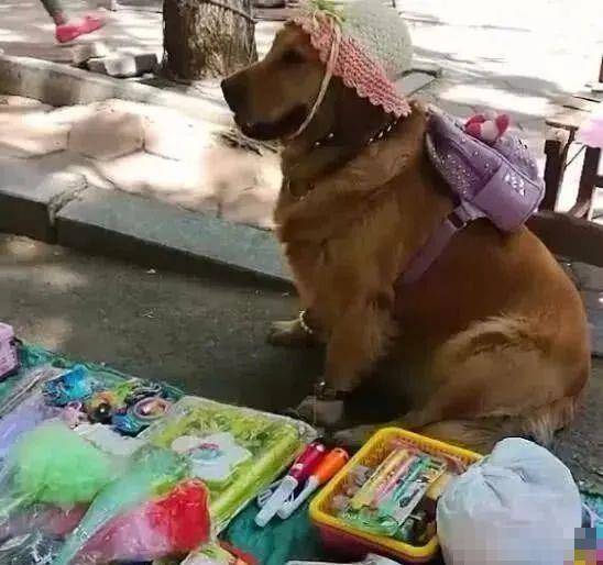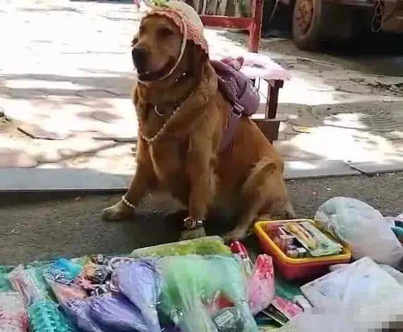 這天鏟屎官突發奇想,何不讓自家的金毛狗狗幫忙招攬生意呢?說干就干,主人把自家的金毛狗狗帶到地攤上,大金鏈子小手表,粉色帽子紫色的包,手腕上再戴一個牙白的手串。