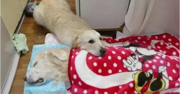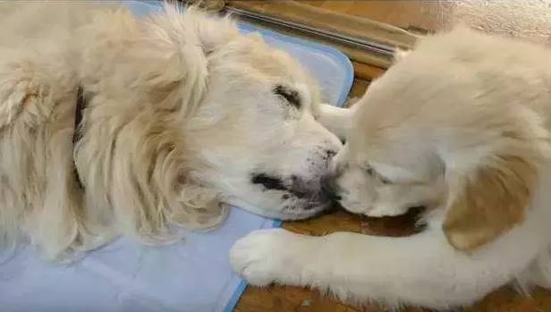 看著金毛姥姥睡著了,金毛寶寶就會不停的舔著它的鼻子,嘴里發出委屈的嗚嗚聲,好像在不停的呼喚金毛姥姥不要睡著了,或許它也害怕金毛姥姥一覺睡去就再也醒不來。