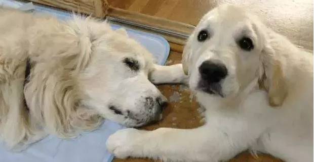 老金毛一生有很多孩子,但基本上都送出去了,留下的一只現在也生金毛寶寶了。金毛寶寶現在3個月大,最是調皮搗蛋的時候,可這兩天不知道為什麼,或許能感應到金毛姥姥即將去世,于是每天寸步不離的守候在金毛姥姥身邊。