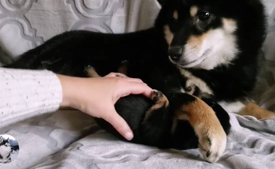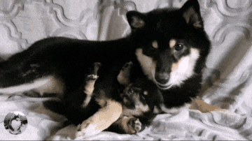 小柴犬被狗媽摟住,因為力氣太大,小狗在地上打滾起來,一直試圖掙脫狗媽的「懷抱」,但狗子就一直不放手,哪怕小奶狗叫得已經很大聲了。