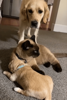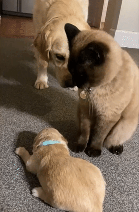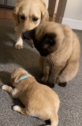 貓咪被落單小金毛吸引到了,就圍著它好奇的打量,而聽到孩子的呼救聲,金毛媽媽立馬趕來護崽...