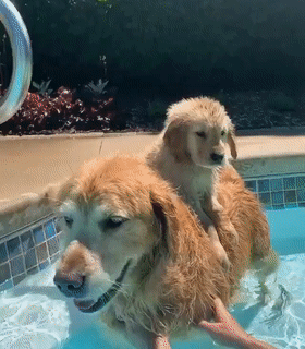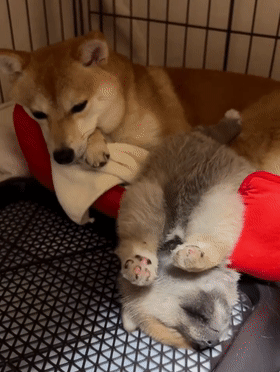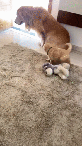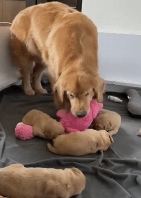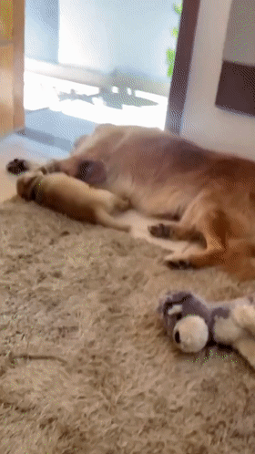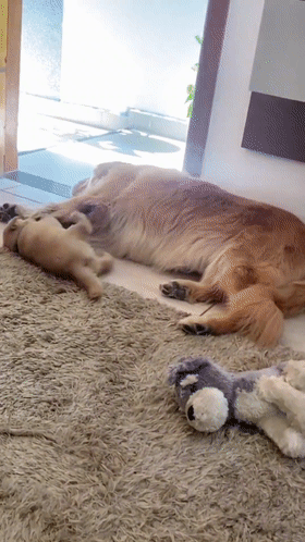 金毛媽媽剛想休息一下,金毛寶寶就黏過來想找它玩,接著媽媽直接一招裝睡,把寶寶也順勢撂倒...