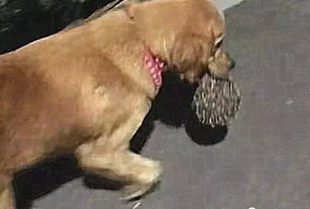 等狗狗把木球叼到身邊后,主人擰起來一看,原來是一只沾滿泥土的刺猬。刺猬的個頭不算小,再加上附近都是小區,基本不太可能是野生的,應該是飼養它的主人嫌味大,這才把刺猬給扔了。