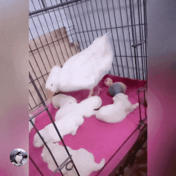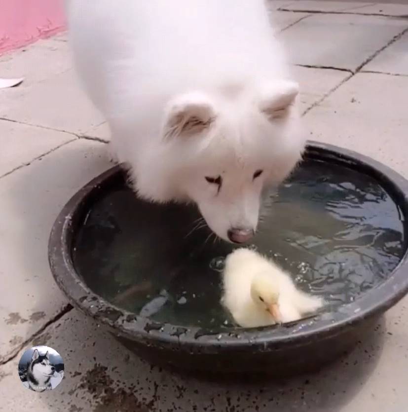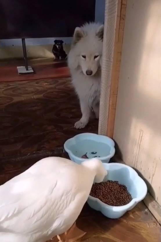 「看它自己在家里,總覺得它很無聊」,為了讓毛孩子生活充實一些,鏟屎官就從父母家要來了一只小白鵝,這樣狗狗就有個伴了。
