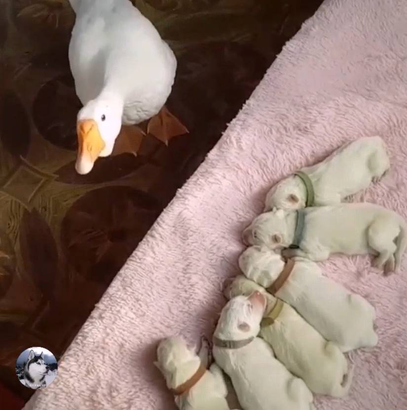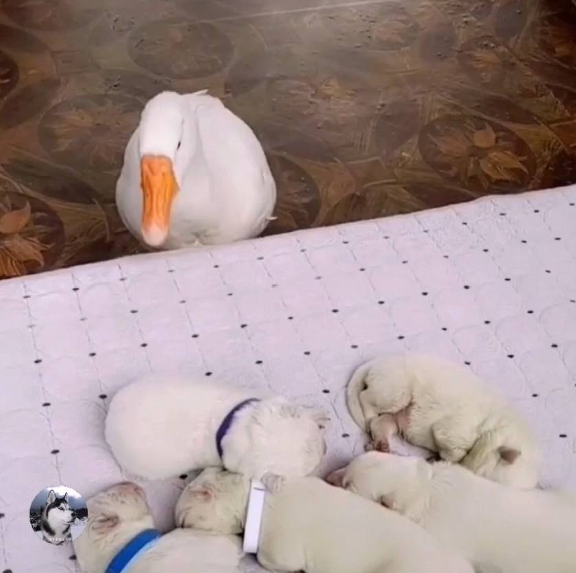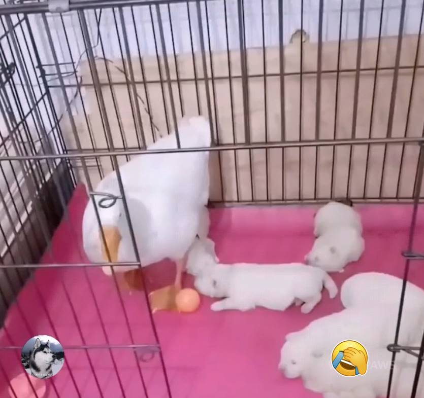 大鵝把小狗當成了自己孩子,有很強的保護欲。