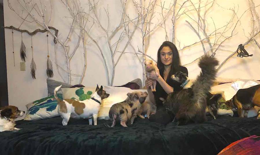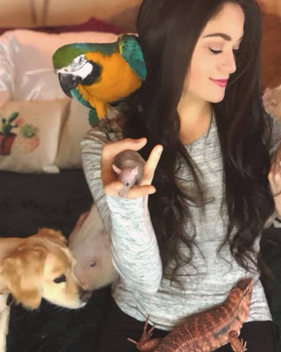 這位31歲的狂熱動物愛好者阿德里·拉謝爾分享了她11,000平方英尺的房子,里面養了90只不同的動物。它們都有自己的名字,而且幾乎所有動物都以「指環王」中的人物命名。拉謝爾飼養了22頭豬、12只狗、8只雞、6只貓、4只鸚鵡、4匹馬、4只孔雀、4只老鼠、3只無毛豚鼠、2只山羊、2只鴨子、2只鸚鵡、2頭奶牛、2頭小母牛、2頭羊駝、2只雪貂、2只壁虎、1只提谷蜥蜴、1只胡子龍蜥蜴、1只騾子、1只倉鼠和1只兔子。一只烏龜和一條蟒蛇。這麼多動物,堪比動物園了。