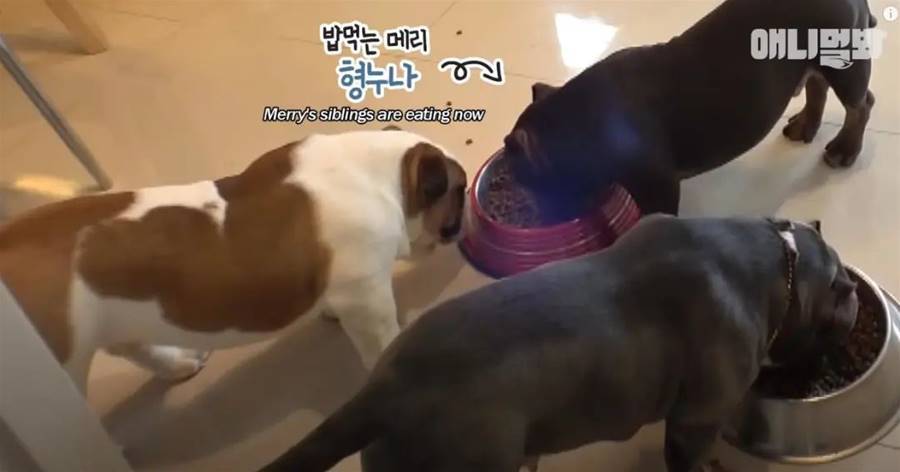 可憐家里的幾只大狗,在Merry吃東西的時候,只能撿點Merry掉在地上的狗糧度日...