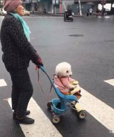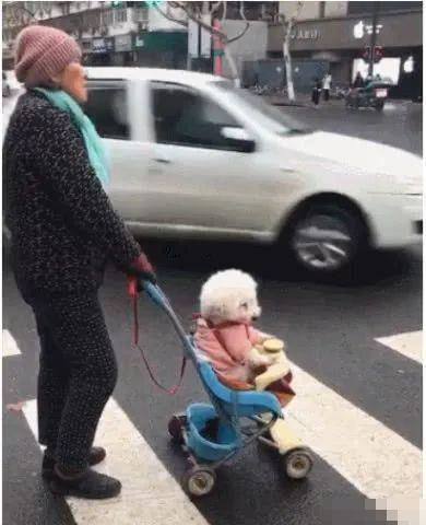 路上就看見一位奶奶正帶這自家的狗子遛彎,只見奶奶推著車,這狗子安逸的坐在里邊很享受的樣子,這奶奶已經把這狗子當成自家的親人了把!就像推著大孫子一樣!