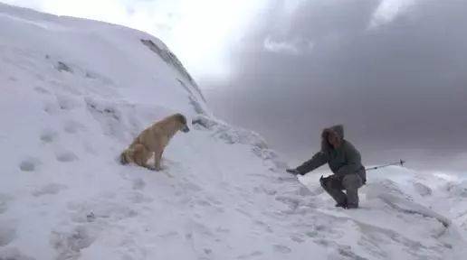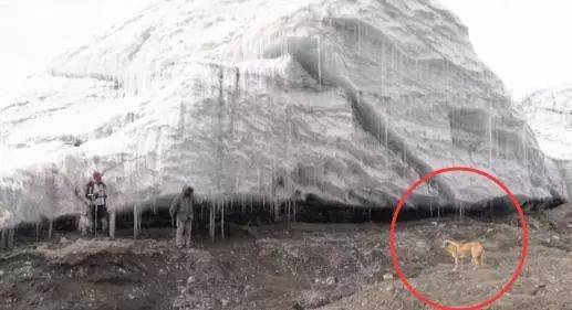 一行人跋山涉水后,終于抵達了普若崗日冰川,正當攝制組架設好攝像機時,冰川前突然出現了一只狗!