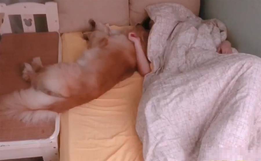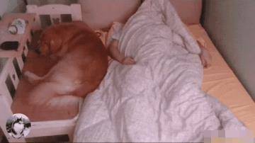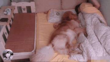 是不是狗子非要睡自己這塊地?主人只好抱著被子自己睡60公分的嬰兒床去,結果毛孩子還是不死心,又偷偷地溜了過來,然后把頭靠在了主人身上。