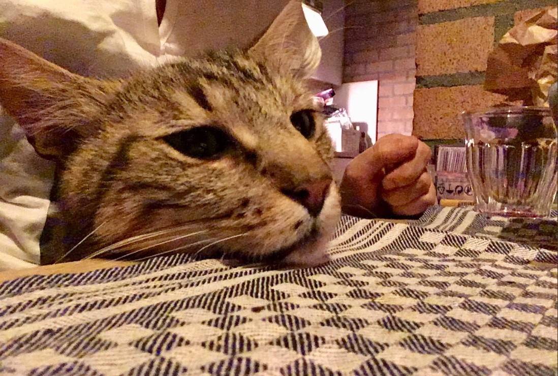 而虎斑喵在他們起床後,並沒有驚慌失措地想要逃跑,反而自來熟、跟在他們身邊,還主動坐在餐桌上等著吃早餐呢,完全當自己家無誤,讓夫妻倆既驚訝又好笑。
