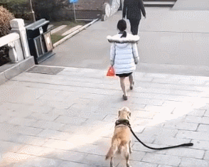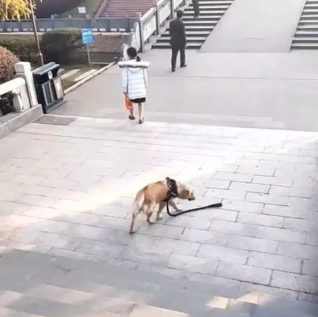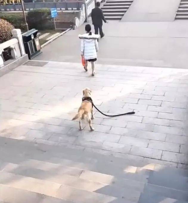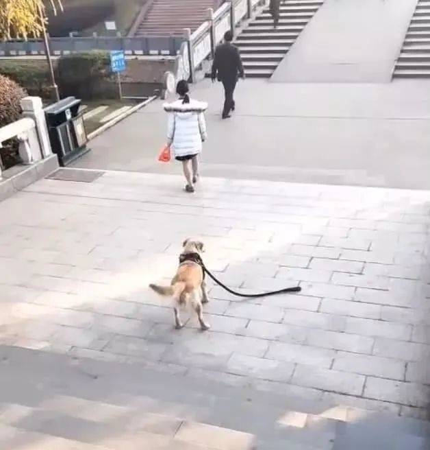一女主人帶著金毛去逛街,走到一石頭階梯的地上,可能是忘了還是怎麼的,主人丟掉了狗繩。這一舉動很快被金毛察覺,當時狗子在原地愣了一下,估計當時還以為主人要拋棄它,接下來狗反應亮了.
