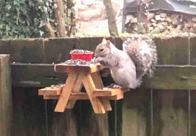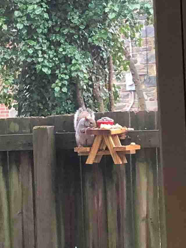 就這樣,瑞克的院子裡自從多了小餐桌後,松鼠們又來得更頻繁了,只要瑞克在家,時不時都能看到有松鼠來吃東西,這讓瑞克也超開心,「我相信牠們肯定喜歡這個餐桌。」
