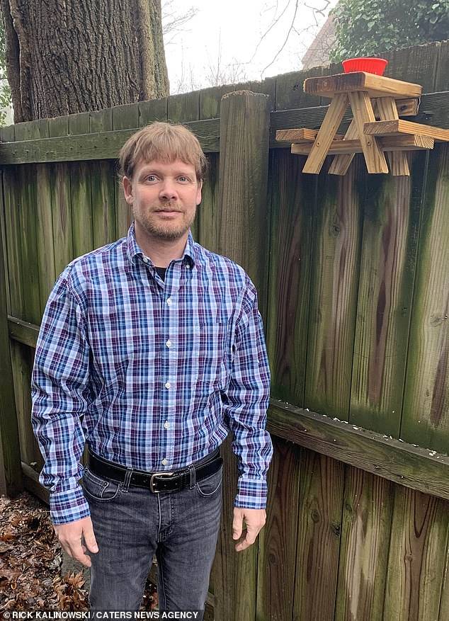 瑞克表示自己一直是「松鼠控」,他覺得毛茸茸的松鼠實在太可愛了,因為經常有幾隻松鼠會到他家院子串門,瑞克便想向牠們示好,于是決定送松鼠們一份「禮物」——他利用一些木頭自製了一張小野餐桌,然後釘在了圍籬上,要給來訪的松鼠們一個專屬的位置吃東西www