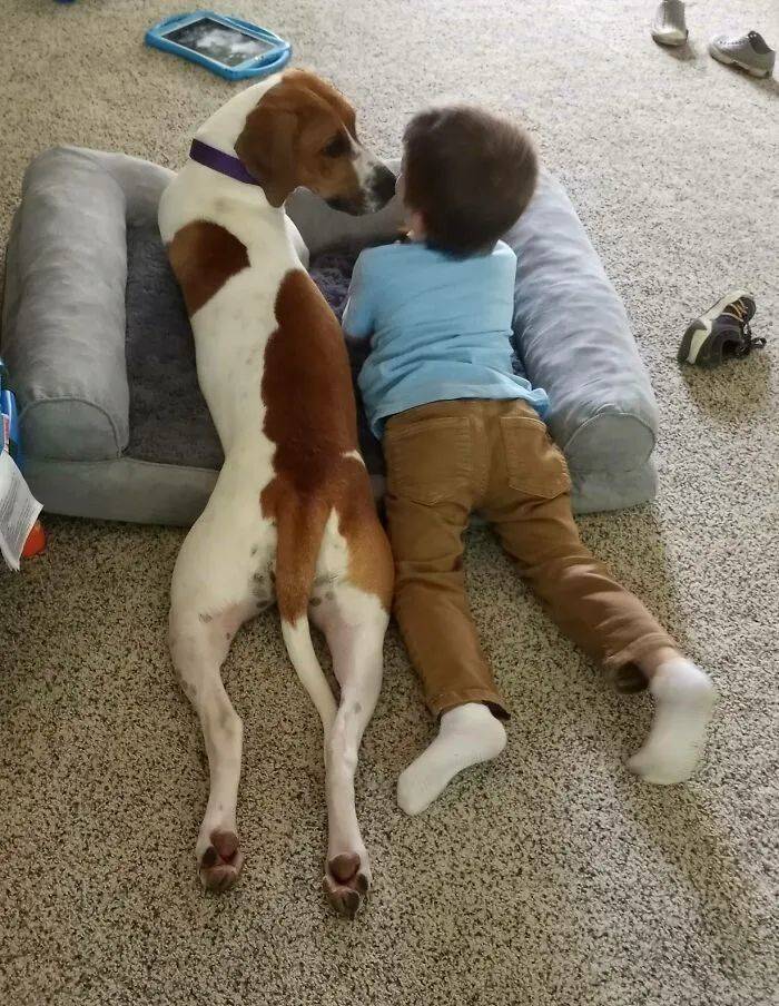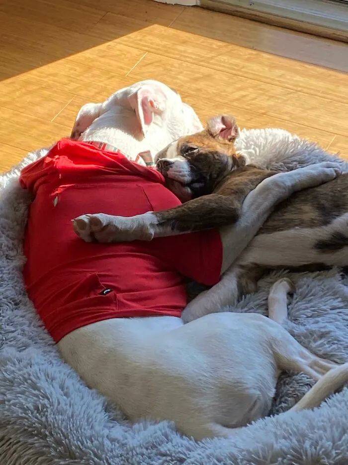 「領養了一只有過不好的經歷的小狗,我家大狗就這樣經常抱著安慰它。」