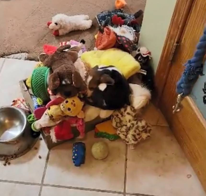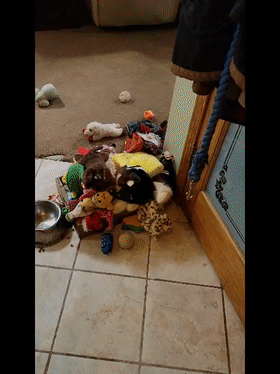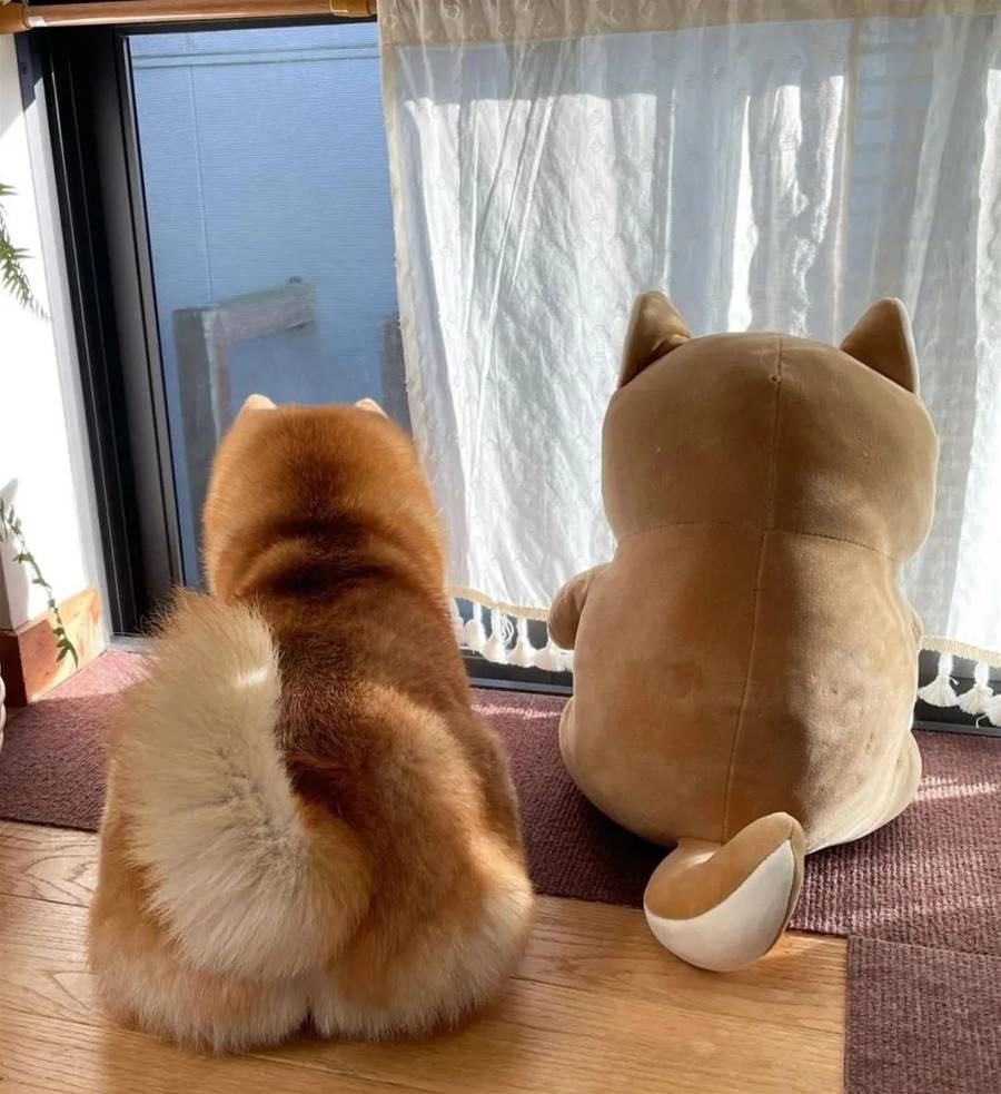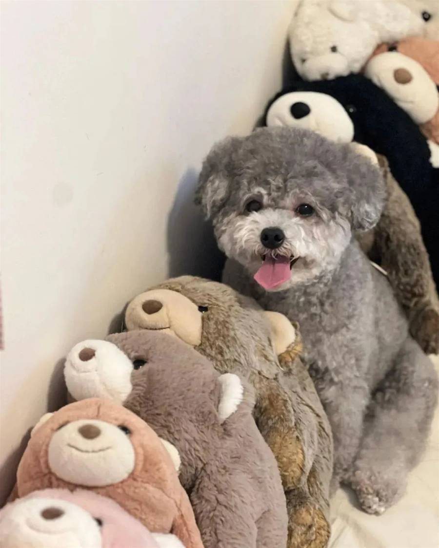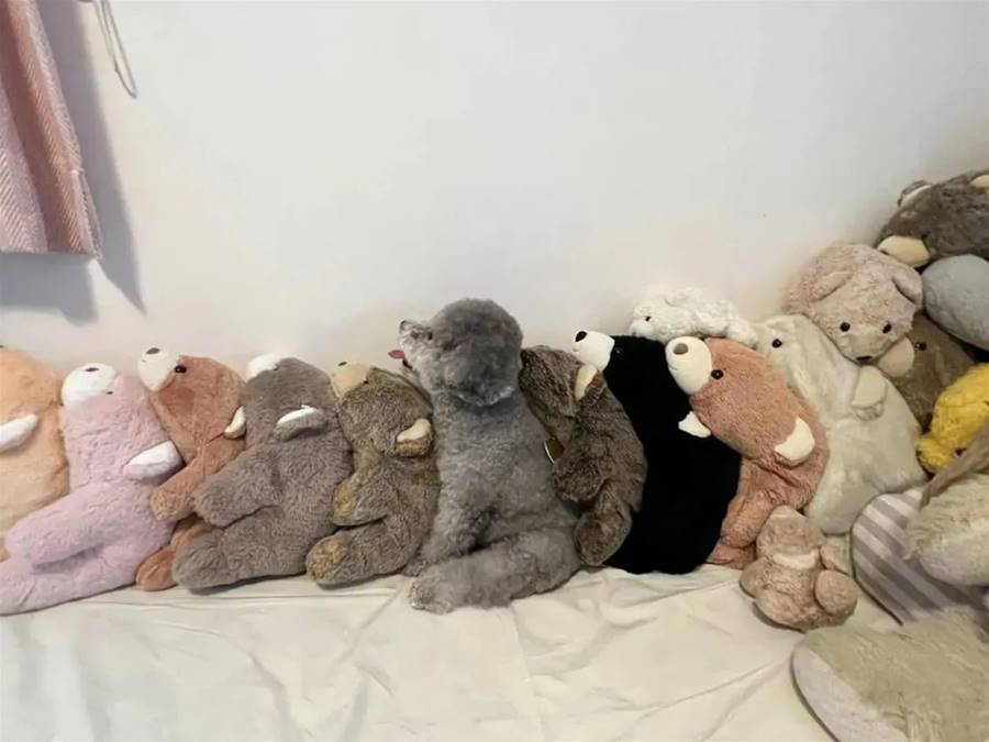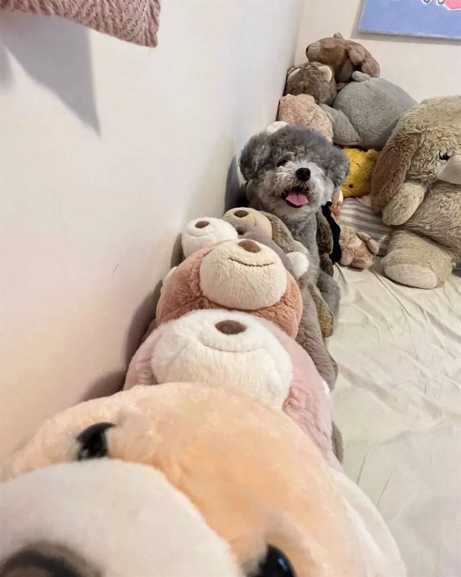 而下面這個鏟屎官在整理床上玩偶時,狗子非要在一旁湊熱鬧,于是鏟屎官把它也安排進去了...