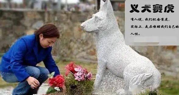 ▼三十多個職工在煮一鍋肉準備吃,賽虎嗅出了肉里有毒,拼命吠叫阻止人們去吃,但人們不明白,以為狗想吃肉,就扔給它幾塊,但賽虎不吃,還是不停吠叫,甚至開始哀嚎。最后,在人們要去吃肉時,這只狗狗流著淚,一聲悲鳴,吃掉了地上的肉,當場中毒而死。九江市賀家山陵園總經理聽說后非常感動,把賽虎移葬到賀家山陵園,為這只舍身救人的義犬建造了雕像。移葬那天,有一百多人冒雨自發為賽虎送行……
