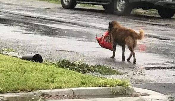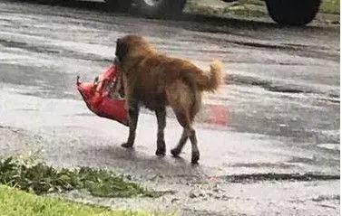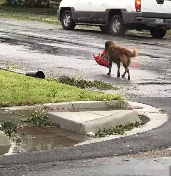 可是回來時候的樣子,大家都哈哈大笑,這狗狗逃跑居然還帶著自己的狗糧呢,不知道該說狗狗有靈性還是說它是個吃貨呢?