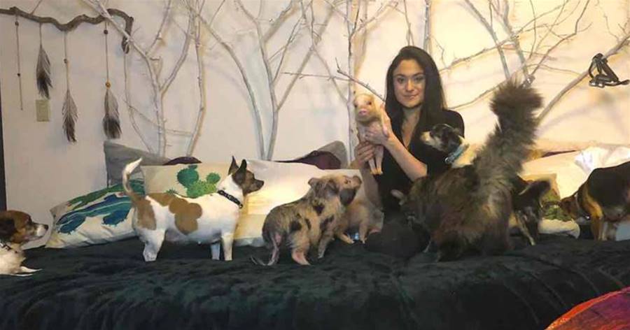 這位31歲的狂熱動物愛好者阿德里·拉謝爾分享了她11,000平方英尺的房子,里面養了90只不同的動物。它們都有自己的名字,而且幾乎所有動物都以「指環王」中的人物命名。拉謝爾飼養了22頭豬、12只狗、8只雞、6只貓、4只鸚鵡、4匹馬、4只孔雀、4只老鼠、3只無毛豚鼠、2只山羊、2只鴨子、2只鸚鵡、2頭奶牛、2頭小母牛、2頭羊駝、2只雪貂、2只壁虎、1只提谷蜥蜴、1只胡子龍蜥蜴、1只騾子、1只倉鼠和1只兔子。一只烏龜和一條蟒蛇。這麼多動物,堪比動物園了。