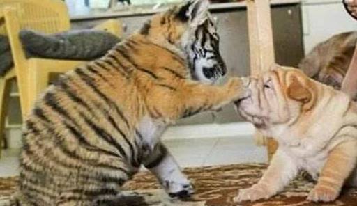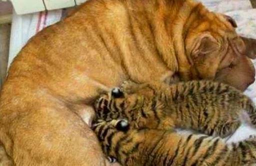 其實除了母豬被當成老虎的媽媽,它們連狗狗也不放過,這只沙皮狗的孩子和小老虎是同時出生的,而且它們都喝著沙皮狗媽媽的奶長大,在狗媽媽的照顧下,老虎變得像狗一樣的溫順,還能像狗一樣的聽話,和小沙皮狗之間相處的關系很好。