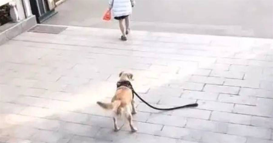 一女主人帶著金毛去逛街,走到一石頭階梯的地上,可能是忘了還是怎麼的,主人丟掉了狗繩。這一舉動很快被金毛察覺,當時狗子在原地愣了一下,估計當時還以為主人要拋棄它,接下來狗反應亮了.