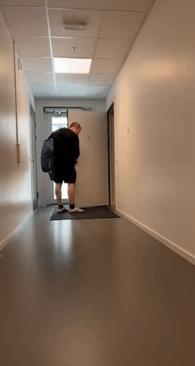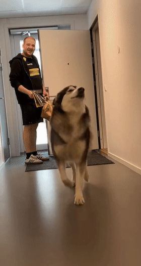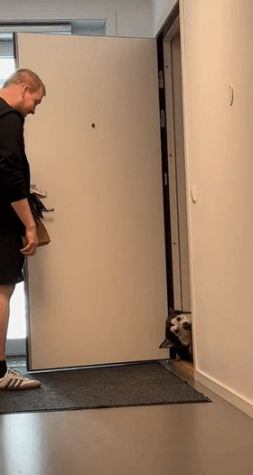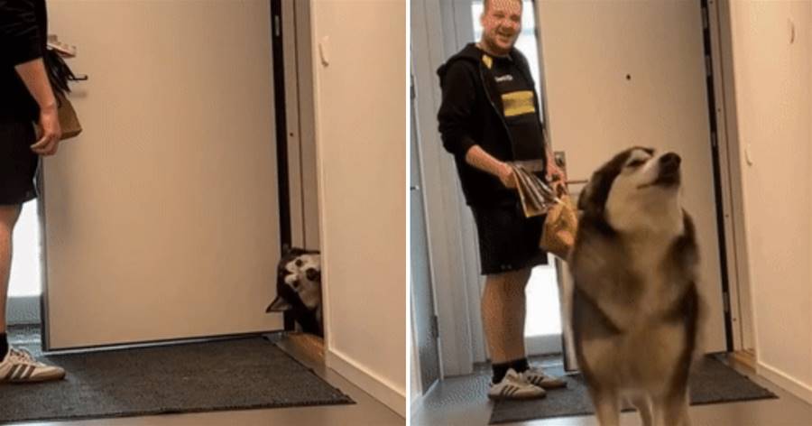 這只哈士奇看到爸爸回來,躺在門口的它只是探了下頭,根本沒打算起身。