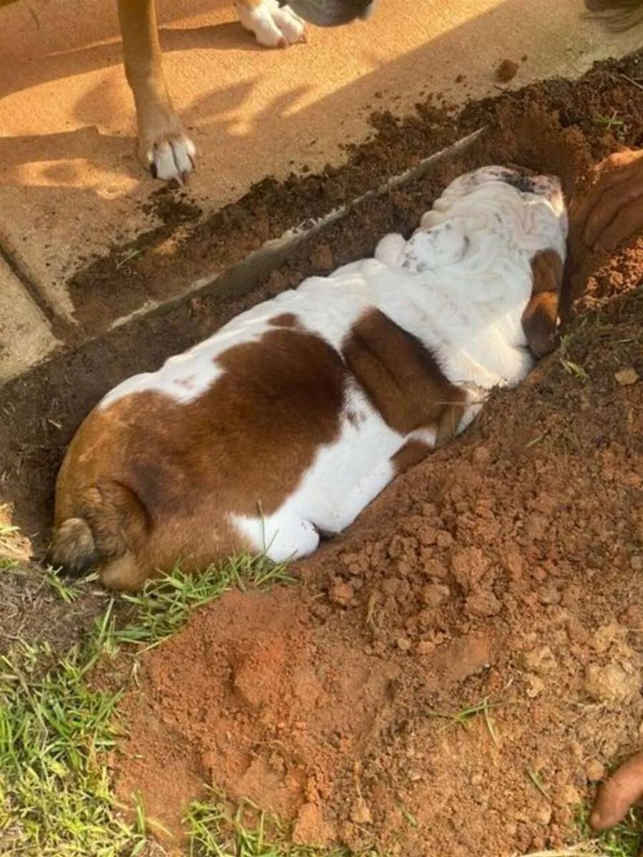 鏟屎官原本想在家挖了個排水溝,英斗就覺得這是為它量身挖的「土坑」,然后就臥在里面不肯走了。